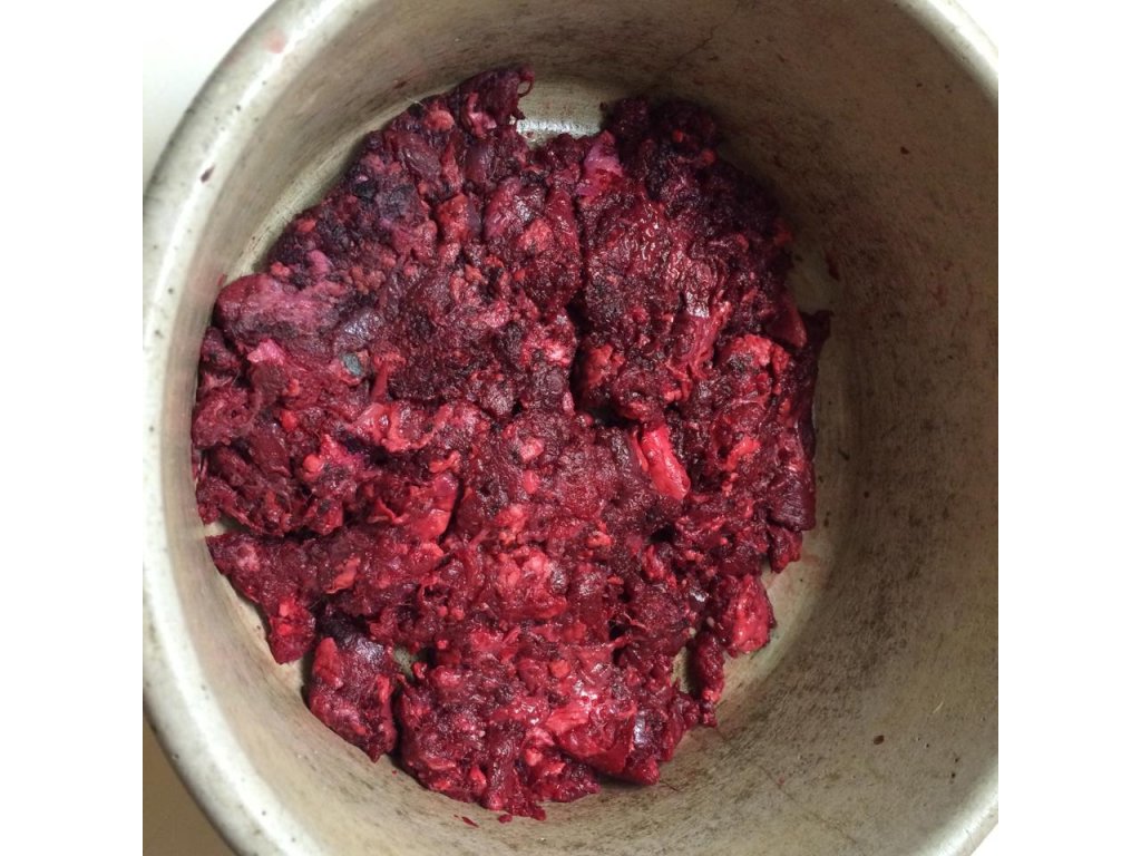 Hlavní složkou tohoto kompletu je maso z vysoké zvěře a jehněčí vnitřnosti a dále je doplněn o červenou řepu. Výhodou masa z divokých zvířat je to, že takovéto maso neobsahuje zbytky léčiv, svaly jsou tvořeny jemnějšími vlákny a obsah mezisvalového tuku je velmi nízký. Zvěřina z vysoké je pro psa tou nejpřirozenější možnou stravou jakou mu můžeme nabídnout. Nutričně a biologicky je zvěřina velmi hodnotná, protože obsahuje výborně stravitelné bílkoviny a pouze 1%-3% tuků. Zvěřina přirozeně obsahuje velké množství vitamínů (A, D, C, E, B) a minerálů (vysoký obsah např. železa, zinku, fosforu, mědi a selenu). Na rozdíl od zvířat chovaných člověkem na maso, obsahuje zvěřina i určitě množství sacharidů v podobě svalového glykogenu. Specifická vůně a chuť zvěřiny způsobuje její vysokou chutnost a oblíbenost u většiny psů. Tato kombinace je vhodná i pro alergiky, protože jehněčí maso i zvěřinu řadíme k hypoalergenním druhům masa. Více o eliminační dietě a krmení psů alergiků najdete v našem článku. Aby bylo krmení syrovou stravou vyvážené, je potřeba zařazovat do jídelníčku i vnitřnosti. Vnitřnosti jsou bohatým zdrojem vitamínů a minerálů. Vnitřnosti sami o sobě působí projímavě a nedoporučuje se je krmit samotné. Navíc mnoho pejsků vnitřnosti odmítá jíst. Proto nabízíme Zvěřino-jehněčí komplet, který tato negativa řeší - vhodnou kombinací je snížena pravděpodobnost průjmu a také se zvyšuje atraktivita pro psa.