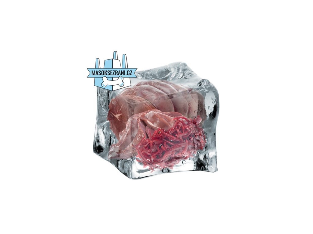 BARF - ZVĚŘINO - JEHNĚČÍ KOMPLET je mleté syrové maso určené ke krmení psů a jiných domácích šelem. Maso je mleté a zabalené v plochém PE/PP obalu. Výhodou tohoto balení je dobrá skladovatelnost, protože zabírá v mrazáku málo místa a zároveň je možné celkem snadno ulomit a rozmrazit jen část balíčku. Veškeré použité suroviny odpovídají potravinářské kvalitě.