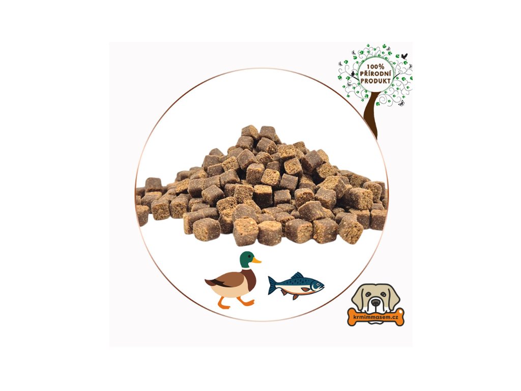 Vysoký obsah masa – 21,8 % kachního masa, 15,8 % sušené maso z lososa