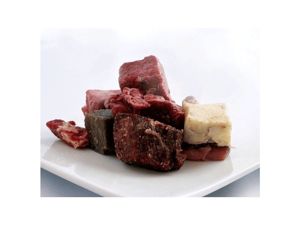 Každá kostka je pečlivě nakrájena na zvládnutelné 2x2 cm kousky pro snadné porcování a zajištění kompletního jídla.